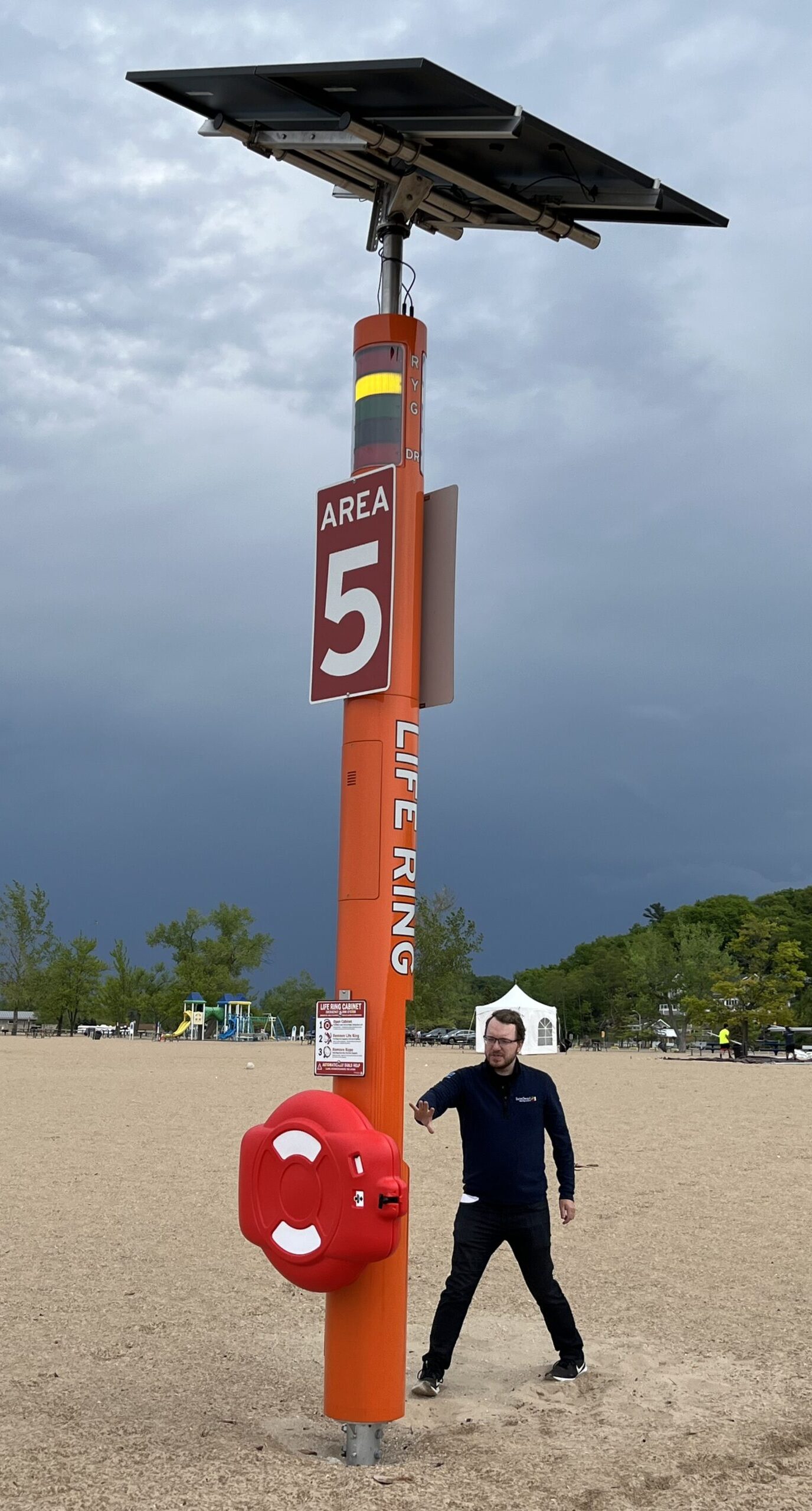 The rescue stations metal enclosure measures 12.5″ in diameter and stands 12 feet tall to the bottom of the light. The top of the metal pole is approximately 15 feet tall. As of now the current solar assemblies add another 6 feet bringing total height to 21 feet tall.